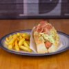 Perro realizado con nuestra salchicha FrankFurter, acompañado de ripio, Queso, Tocineta, Queso Cheddar, cebolla caramelizada y papas a la francesa!