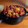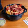 Papas de tu eleccion acompañadas de Carne y Pollo asados, Salchicha Frankfurter, y una capa de Queso Mozzarella