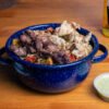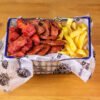 Papas de tu eleccion acompañadas de nuestra Salchicha Frankfurter, trozos de tocineta, una capa de Queso Mozzarella y Queso Cheddar